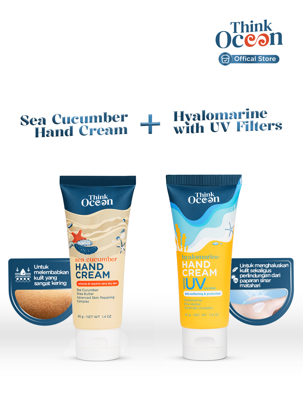With duo Think Ocean Hand Cream Sea Cucumber + Hyalomarine with UV Filters, your skin feels softer, healthier, and protected all day long.